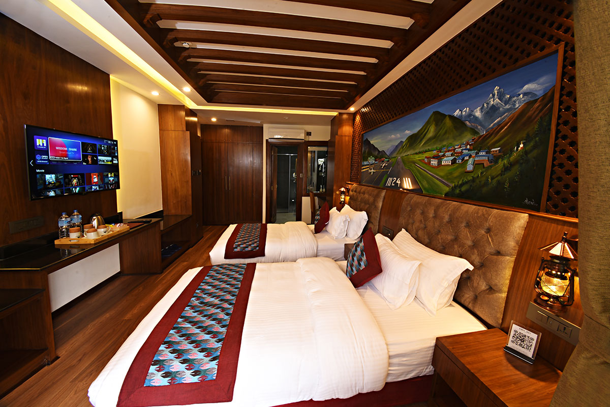 Unveil Magnificent Vistas: Our Superior Deluxe Twin or Double rooms offer an unparalleled experience of luxury and tranquility. Step onto your private balcony and behold the awe-inspiring views of the iconic Swoyambhu Temple, a UNESCO World Heritage Site, as it majestically graces the horizon. Immerse yourself in the serenity of this sacred landmark while enjoying the comfort of our elegantly appointed room. Whether you're savoring your morning coffee or unwinding under the stars, every moment spent in our Superior Deluxe rooms is a journey of relaxation and wonder at Everest Boutique Hotel.
